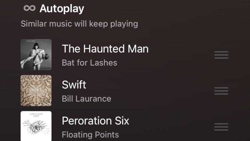 Bir çalma listesi veya albümü dinliyorsanız, şarkı listesi beklendiği gibi ilerleyecektir, ancak listenin altına kaydırıldığında bir sonsuzluk simgesi, “Otomatik oynatma: Benzer müzik çalmaya devam edecek” sözcükleri ve an, çalma listesini takip etmek için seçilen şarkıların kimliği.
