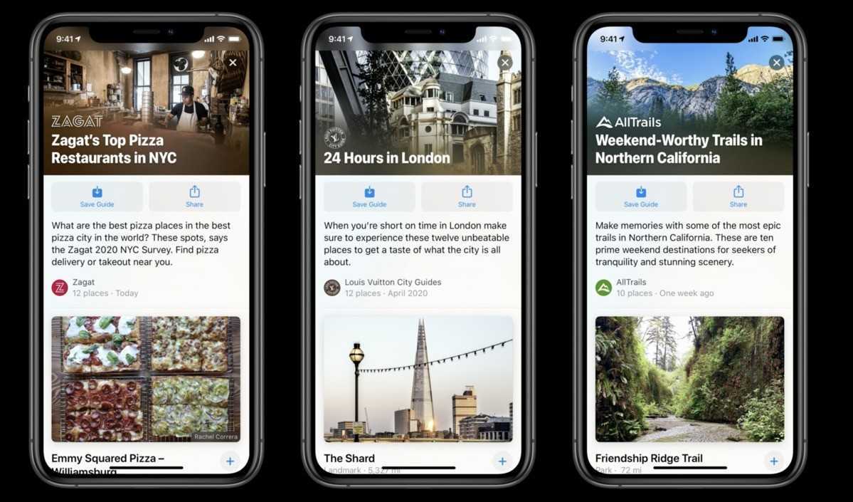 Haritalar uygulaması, yeni Rehberler özelliğiyle büyük şehirlerde ziyaret edilecek yerleri bulmanıza yardımcı olacaktır. Apple, önemli yerler, gezi, restoranlar, oteller, alışveriş ve diğer etkinliklere rehberlik etmek için büyük üçüncü taraf seyahat şirketleriyle birlikte çalışıyor.