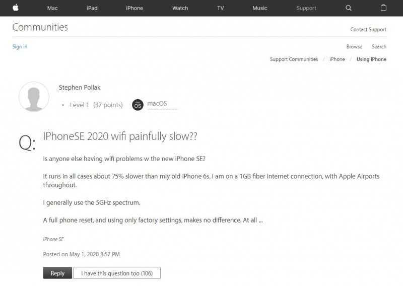 Apple’ın destek sayfasında iPhone SE 2020 modelini alan kişiler tarafından Wi-Fi bağlantısı sorunu için onlarca şikayet yer almakta. Aşağıda Apple destek sayfasından bir örnek yer almakta. Ayrıca diğer forumlarda da bu şikayet kullanıcılar tarafından dile getirilmeye devam ediyor. Bu kadar çok şikayetin olması bu durumun kronik bir sorun olabileceğini akıllara getiriyor.